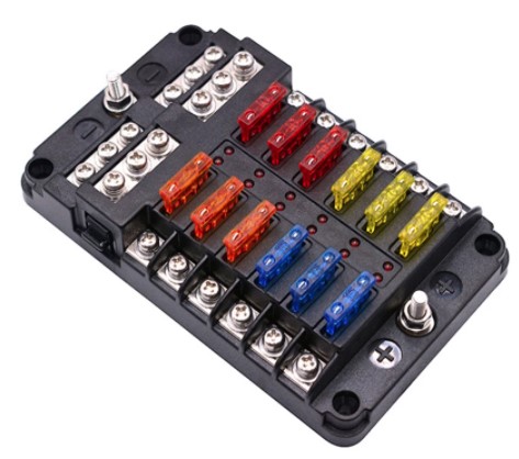 Max 100A per block and 30A per circuit withn red LED lights for blown fuse