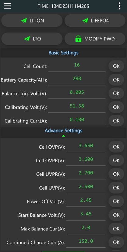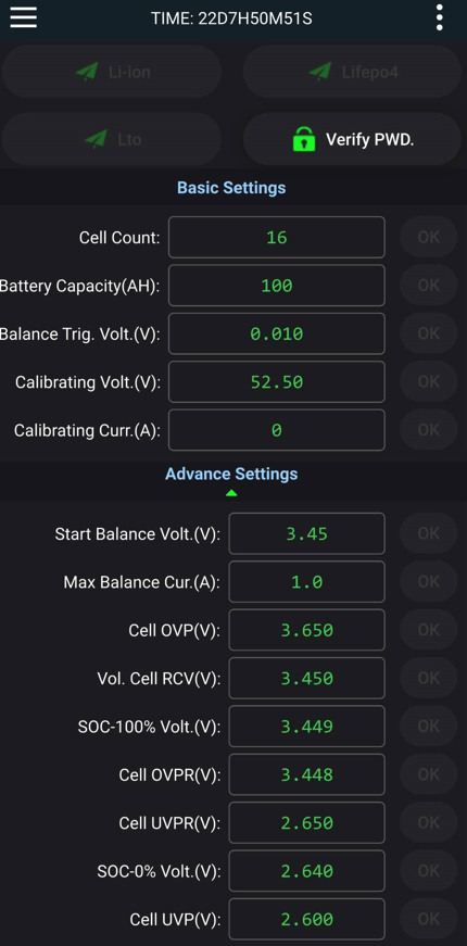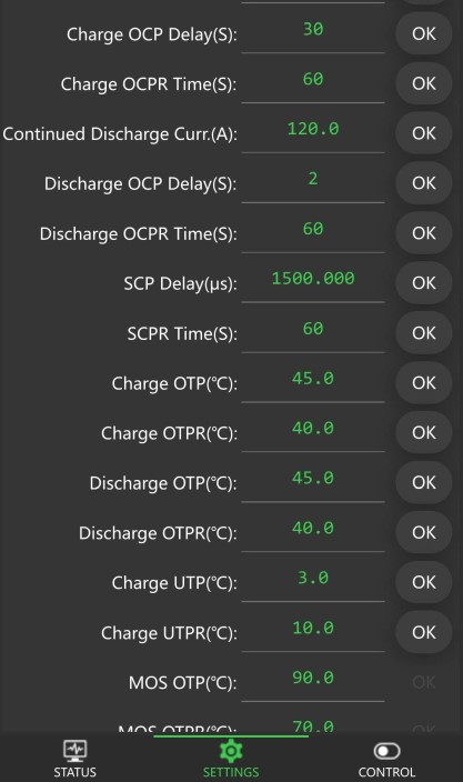 I’m reviewing here the configuration I have set in the Overkill Solar BMS 48/100. These settings are the same as for the XiaoXiang app but are being displayed in a better structure and overview in the Overkill Solar App.