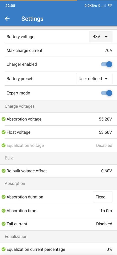 Here are the settings for my Victron Solar Charge Controller but you can adapt these settings for any other controller as well.