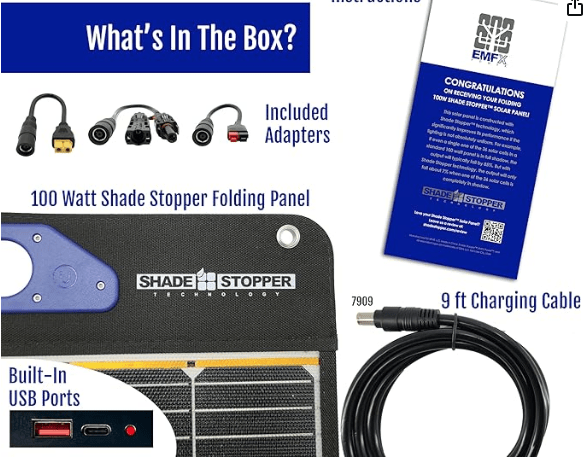 Very high efficiency and power output. Long connection cable with several adapter cables to suit all power stations. The panel can also directly charge devices through USB-C and USB-A with QC3 fast charge capability.